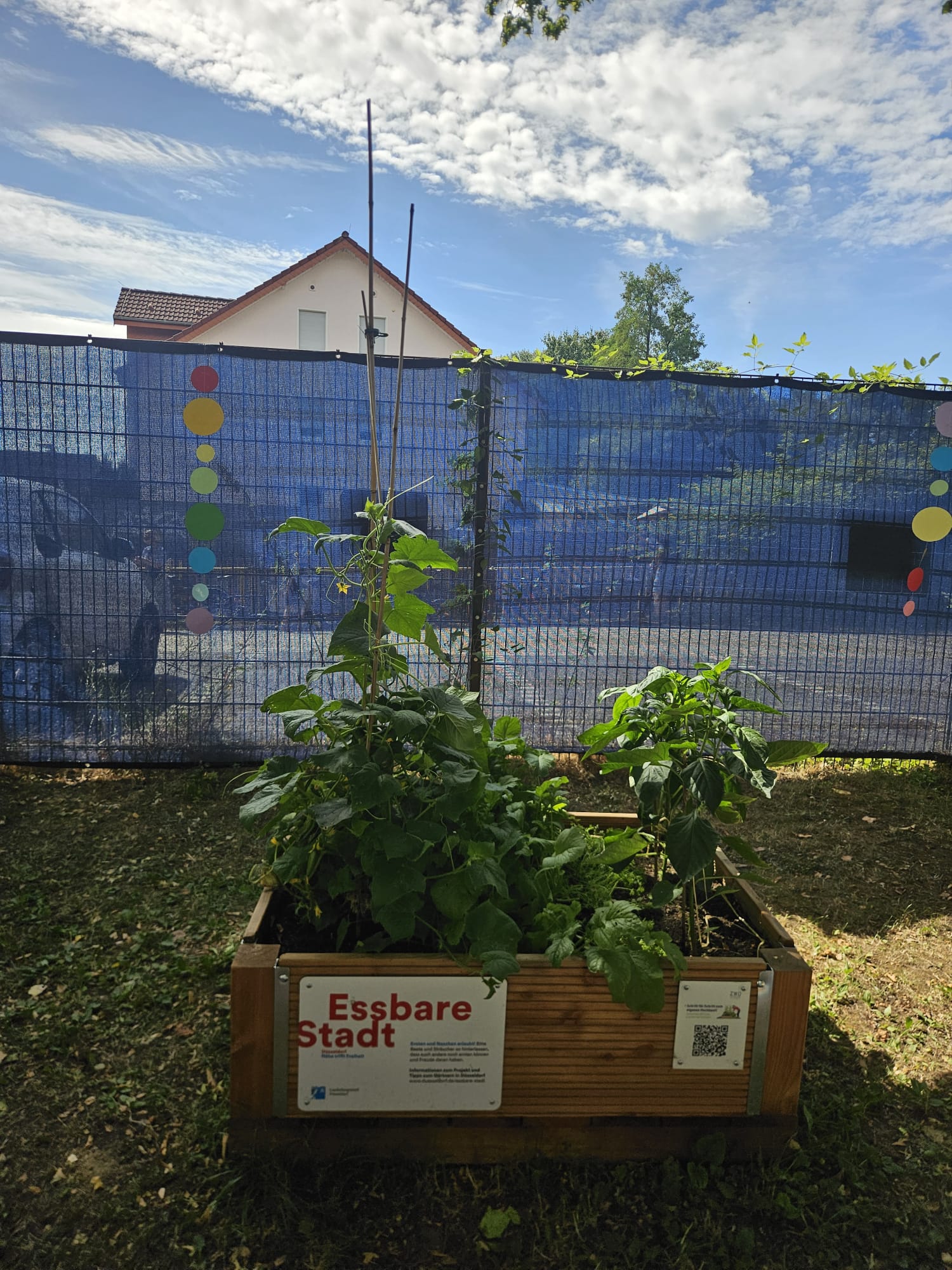 Das von der Stadt Düsseldorf geförderte Hochbeet wurde aufgestellt und es wurden dort u.a. zuhause vorgezogene Paprika- und Gurken-Pflanzen eingesetzt.